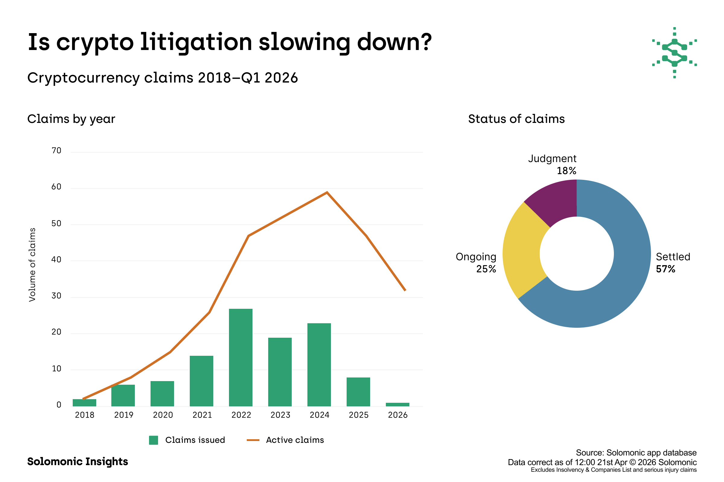 As digital assets mature and become more integrated into mainstream finance, litigation trends are likely to evolve further. Key areas to watch include whether claim volumes will rise again, whether falling or rising crypto prices influence dispute levels, how insolvency and fraud claims develop and whether increased regulation drives more enforcement and shareholder actions.
