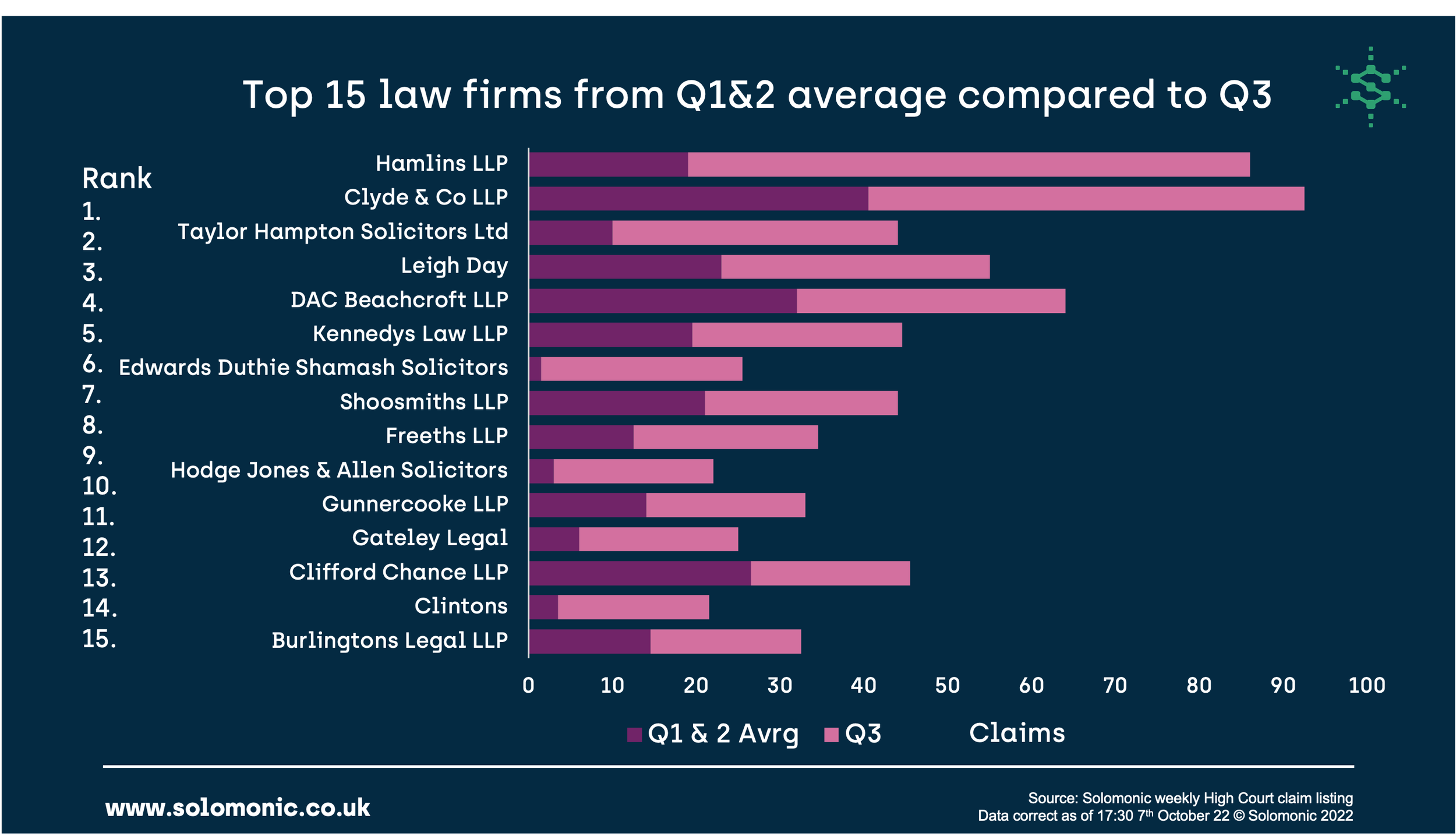 Litigation giant, Clyde and Co remain one of the busiest firms YTD with an increase in litigation for Q3 compared to the average for the previous quarters. Their range of claims is wide, acting for clients on both the claimant and defendant side in shipping, technology, media and telecoms and insurance among others.