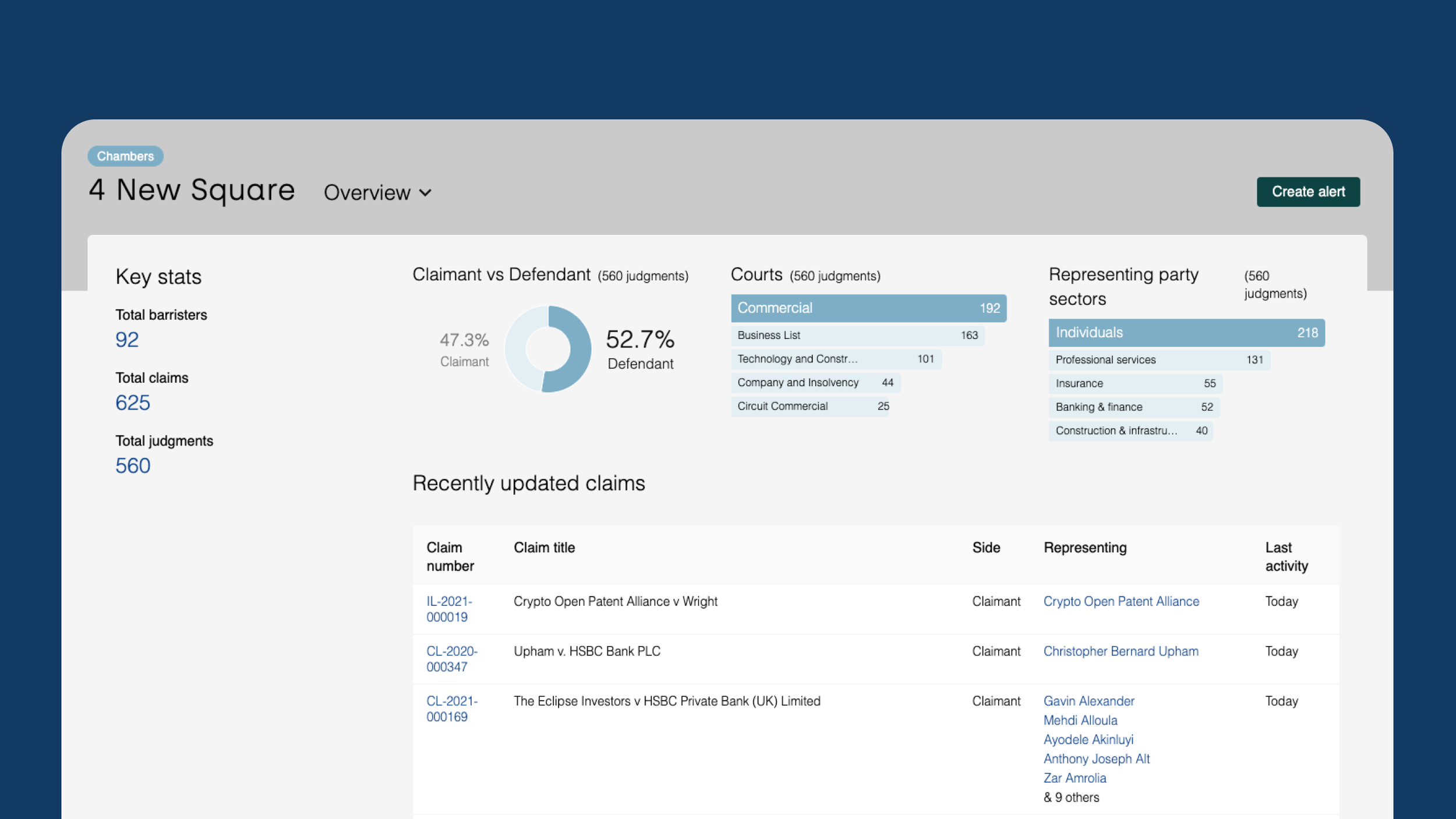 Delve deeper through chamber overview pages for key metrics such as claimant/defendant ratio, the most active courts and sectors represented. See a chambers’ claims and judgments, and explore new analytical views such as win/loss percentage and the relationships of chambers (including which law firms favour specific chambers or set of barristers).