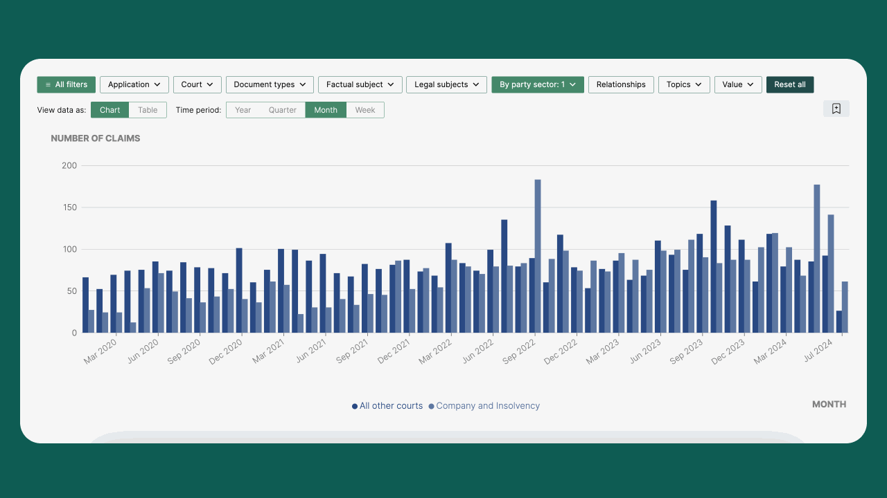We’ve also introduced an additional upgrade for ‘Issue year’ charts, allowing you to view the data on a more granular level. Choose to view claims issued on a yearly, quarterly, monthly or weekly basis. Combined with all the extensive filters available, you can now create almost instant trend views at the click of a button.